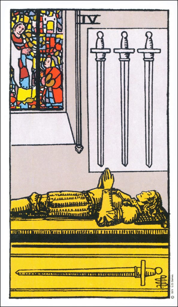 One such piece of hidden code is found in the Four of Swords card. In the top left corner of the stained glass window you will find the Latin word for peace (pax). The artist (Pamela Colman-Smith) and designer of this deck (A. E. Waite) incorporated some hidden symbols to give the cards a deeper level of meaning. (In the image on the right I’ve coloured the word in red to make it easier to see.)