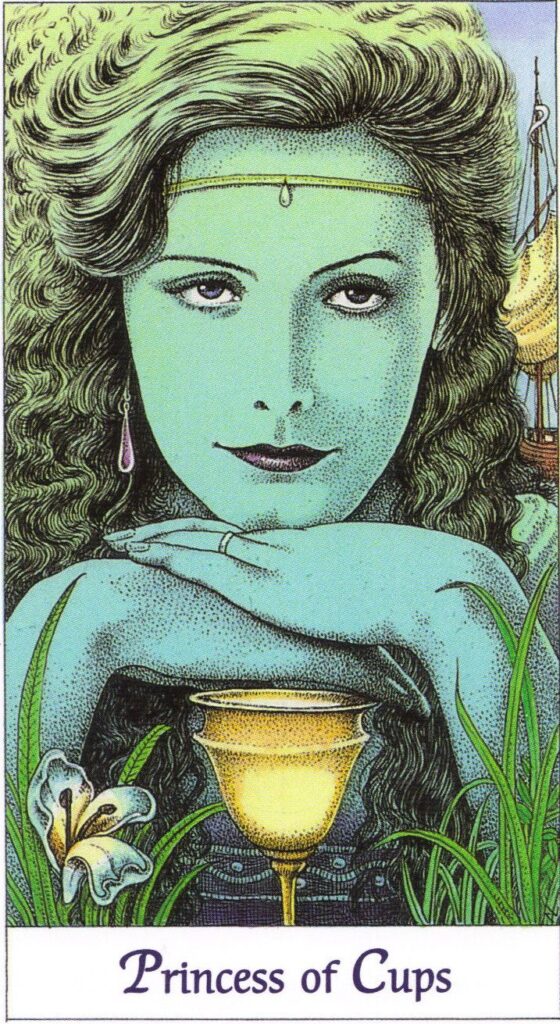 In Tarot decks that follow the Golden Dawn system, instead of having a Page of each suit, this card is designated as Princess or Prince. In this form of Tarot, Hebe is the Princess of Cups. This Court Card represents the younger aspects of a woman and the blossoming of her true self. Her cup is filled with the energy of creativity and affection, femininity, naiveté and sensitive nature. She represents the expression of loving emotions, which could result in a romance or a new relationship. With her youthful attitude, the Princess of Cups has the qualities of honesty and sincerity. She has a healthy dose of imagination while maintaining an appreciation for life’s simple pleasures.