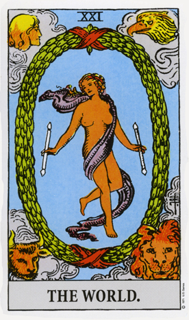 The World: Finally, we come to the last card of the Major Arcana. In this image we see a female figure, draped in a violet sash, dancing in an oval wreath. This dancing figure is similar to the image of the Hindu God Shiva, whose dance of bliss is also a dance of death, representing both the creation and destruction of the universe. The white wands in the woman’s hands show she has the power to create her own reality. The purple sash signifies the attainment of spiritual wisdom. It’s a lovely way to end the sequence of cards known as The Major Arcana.