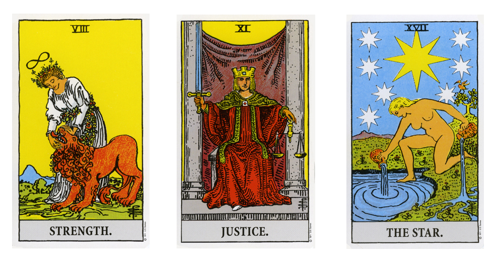 Let’s take a look at some of the main women of the Major Arcana: The High Priestess, The Empress, the maiden in Strength, Justice, The Star, and the dancing lady in the card called The World.