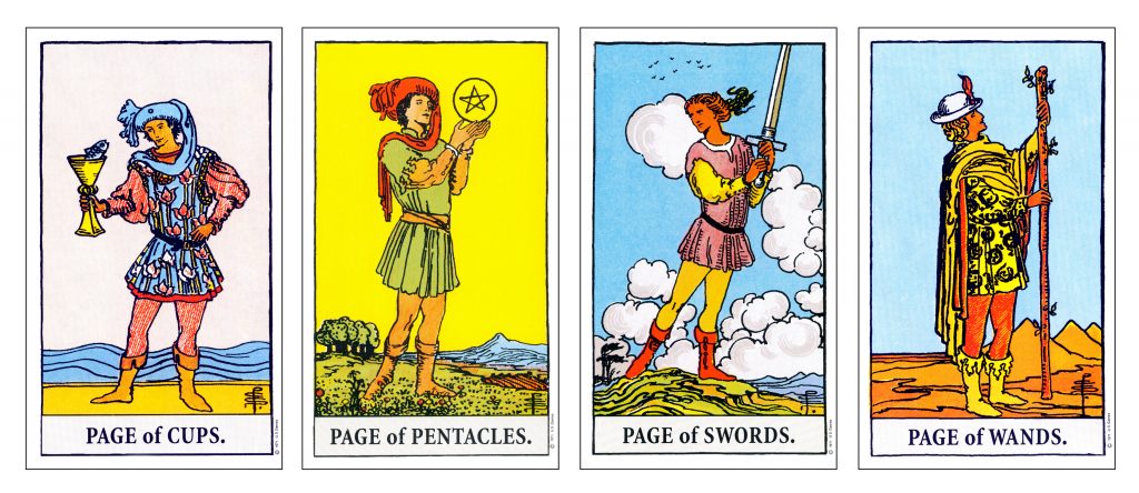 The Court cards begin with the Pages and end with the Kings. The Pages show the potential of the energy of each suit in a condensed form. In the Pages you see the youngest aspect of the family — they have the youthful exuberance and innocent enthusiasm of the young generation. They have ideas but they lack the experience or assets to bring their desires into reality. They have inspiration, but they lack the wisdom that comes with age.